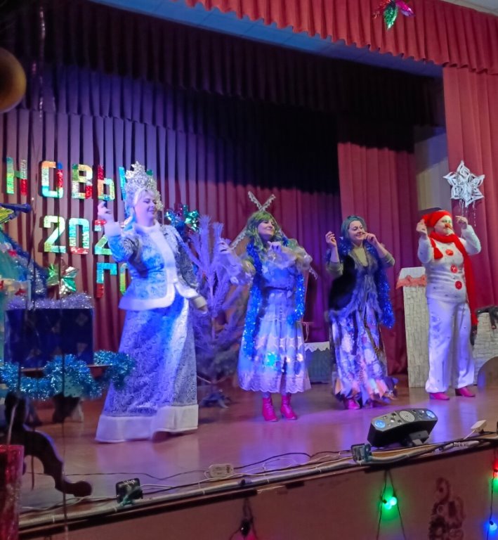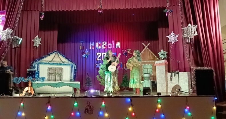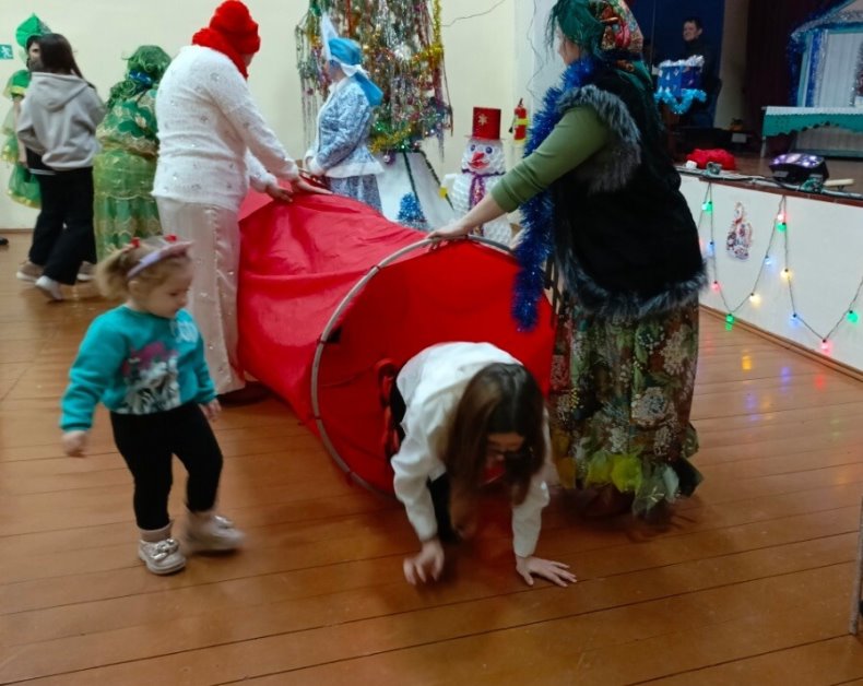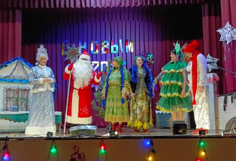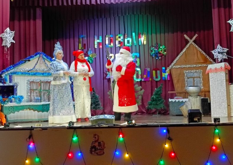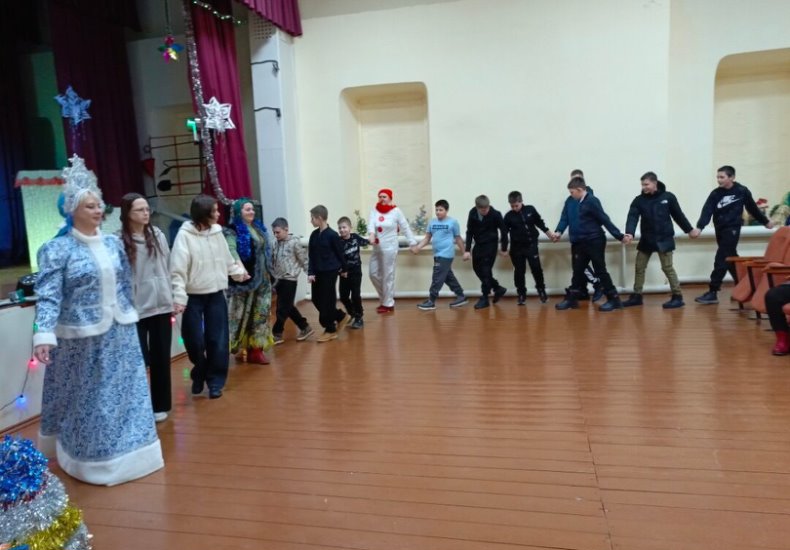 На празднике ребята пели новогодние песни, танцевали, водили хороводы вокруг зелёной красавицы-ёлочки, играли в игры с Бабой Ягой и Снегурочкой. После представления все дети получили сладкие подарки от Деда Мороза.