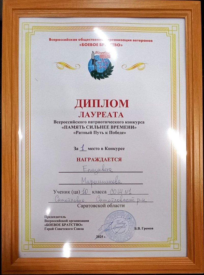 «В конкурсе творческих работ «Память сильнее времени», посвящённом 80-летию Победы в Великой Отечественной войне и Году защитника Отечества, участникам была предоставлена возможность изучить боевой путь воинских частей, сформированных на территории Саратов- ской области в годы войны. Остановить свой выбор темы для сочинения Елизавете помогла книга «Звёзды на крыльях», которая долгое время хранится в музее Самойловской школы. Музейный предмет, пока к нему не проявит интерес человеческая душа, молчалив. Конкурс, организатором которого стало Саратовское областное отделение Всероссийской общественной организации ветеранов «Боевое братство», позволил перечитать книгу, дал возможность экспонату заговорить, рассказать историю создания женского авиаполка, в котором служила автор книги, давнишний гость нашей школы Ольга Тимофеевна Голубева–Терес. Книга Голубевой могла еще долго ждать своего часа, но конкурс приблизил это время.