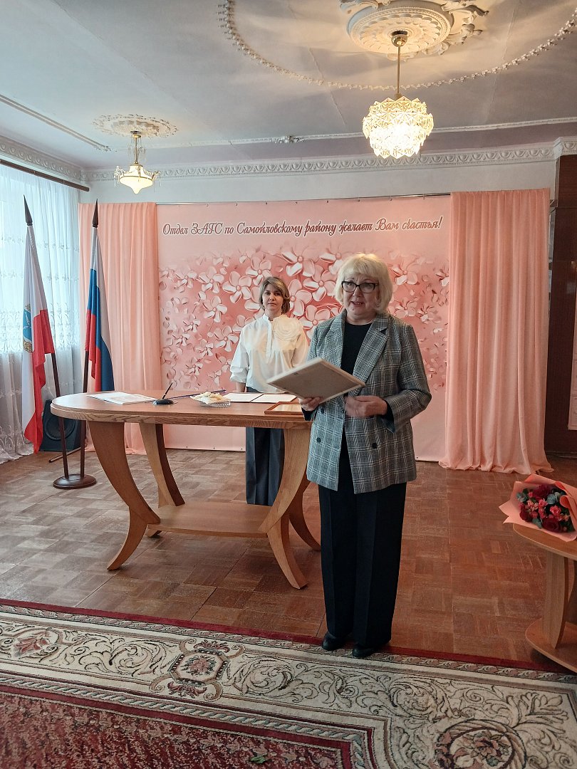 В отделе ЗАГС по Самойловскому району на днях состоялась торжественная регистрация золотого юбилея супружеской жизни Александра Ивановича и Любовь Александровны Лымаревых, которую провела заведующая отделом ЗАГС Ирина Анатольевна Филонская. И это было трогательно! «Молодые», как и положено, не скрывая волнения, расписались в Книге регистрации юбилейных браков, обменялись кольцами, закрепили торжественный момент супружеским поцелуем, а затем муж пригласил жену на свадебный танец, как и 50 лет назад. Невеста была немного смущена, а жених уверенно вел ее по танцполу.