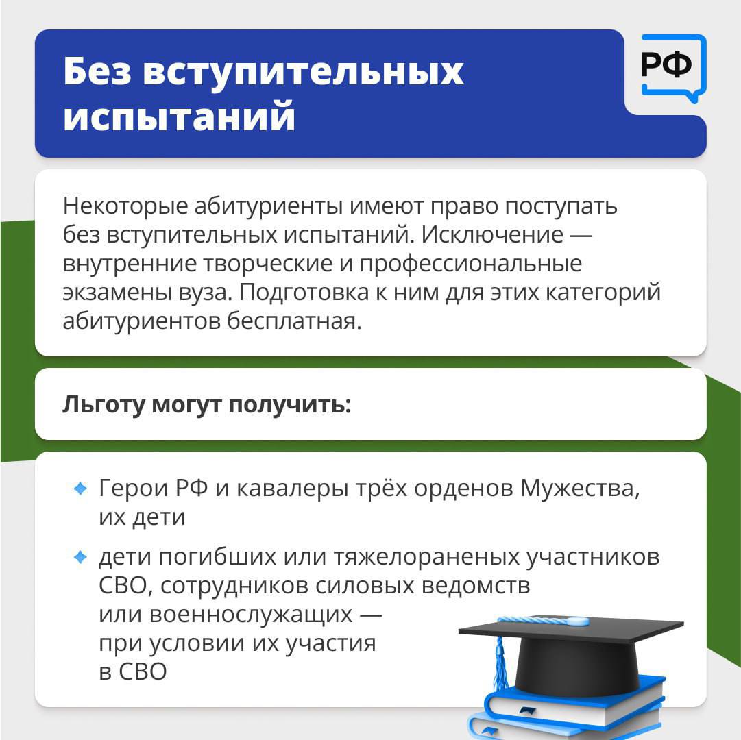 Бойцы могут бесплатно получить высшее образование. Для этого в вузах ввели отдельную квоту для поступления — не менее 10% от всех бюджетных мест. Зачисление осуществляется в приоритетном порядке.